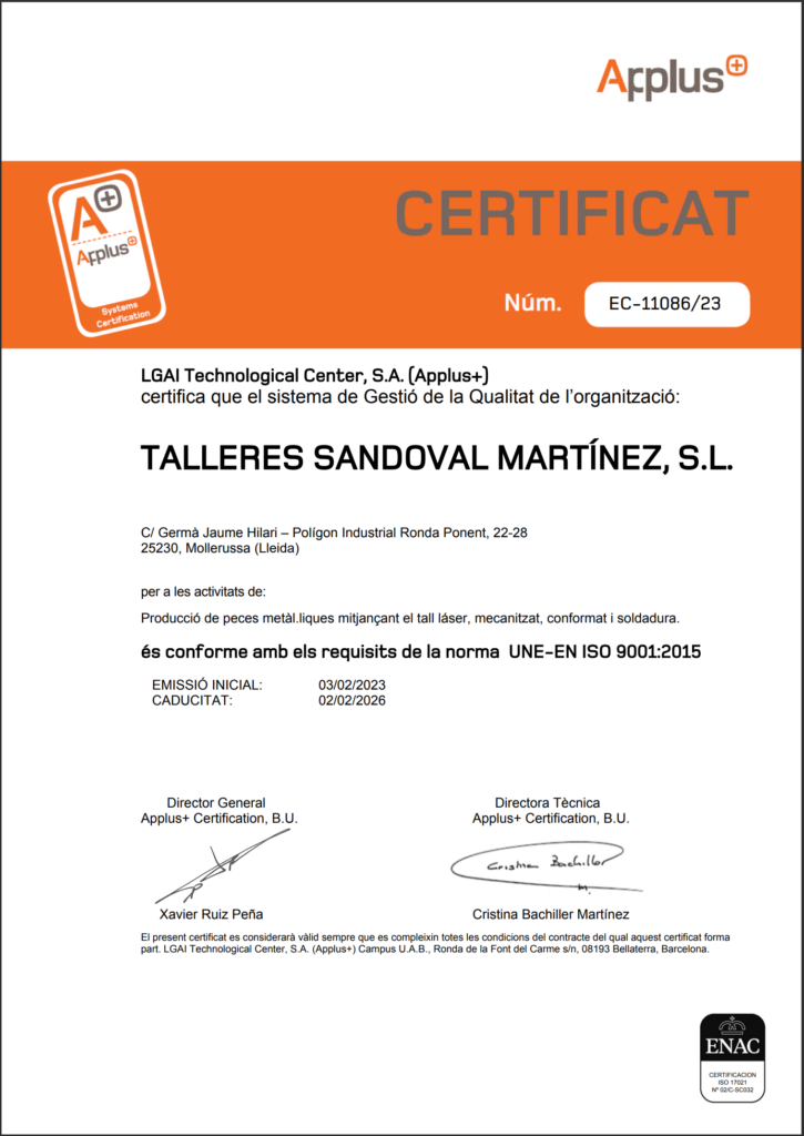 Sandoval-Martinez disposa d’un Sistema Integrat de Gestió de la Qualitat basat en la norma UNE-EN ISO 9001:2015.